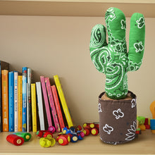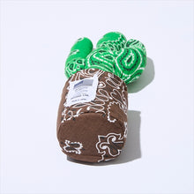 一見すると本物のサボテンのような佇まいですが、実は触り心地の良いファブリックで作られた、ユーモラスなオブジェです。鉢部分にはシックなブラウン、サボテン本体には鮮やかなグリーンを基調としたバンダナ柄を使用し、遊び心とデザイン性を両立させました。